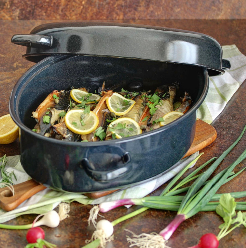 Der emaillierte Backtopf mit Deckel und Metallgriffen eignet sich ideal zum Backen aller Arten von Fleisch und Gemüse im Ofen. Der Boden des Topfes ist so konstruiert, dass er aus mehreren elliptischen Rillen und Erhebungen besteht. Diese Rillen dienen der Sammlung aller Säfte, Fette und Kondensate. Durch das Dampfgaren in einem vollständig geschlossenen System kommt es zu einer beschleunigten Kondensation. So zubereitete Speisen in ihren eigenen Säften behalten einen außergewöhnlich hohen Gehalt an allen wichtigen Nährstoffen und erfreuen sich eines besonders angenehmen Geschmacks und einer schönen Farbe. Die erhabenen Ringe verhindern, dass die Speisen anbrennen, sodass der Topf während des gesamten Backvorgangs geschlossen bleiben kann. Der Deckel kann zudem zum Anrichten von Gerichten mit verschiedenen Salaten verwendet werden. Gleichzeitig eignet sich der obere Topfteil hervorragend für die eigenständige Zubereitung aller Arten von Kuchen, Backwaren aus Teig und Torten nach Wahl. Durch die Verwendung des Backtopfs wird Verdampfung vermieden, wodurch Fette nicht im Ofen kondensieren – eine erhebliche Zeitersparnis beim Reinigen.