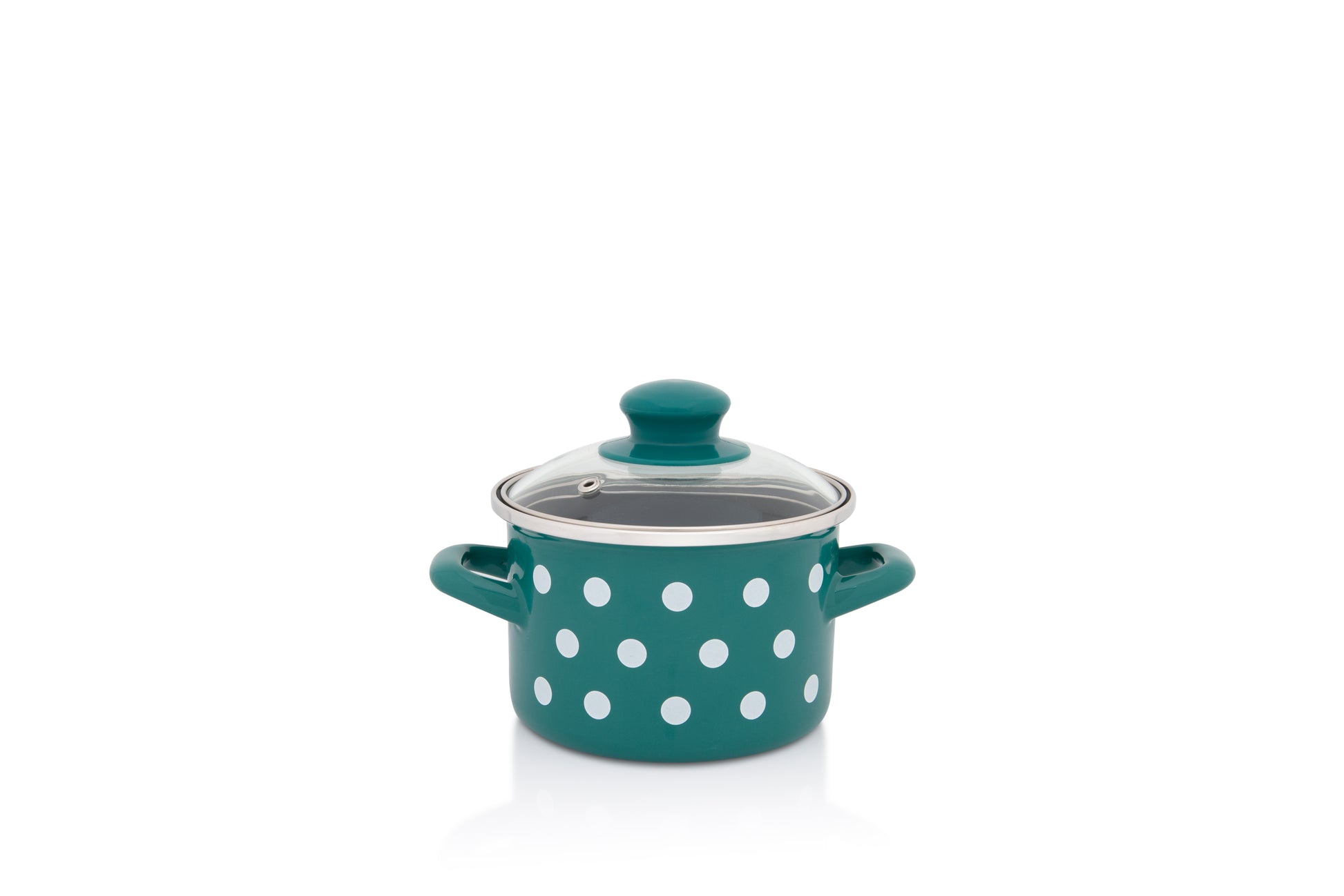 Metalac Kochtopf mit Glasdeckel 14cm|1,5l, GRÜNE PUNKTE, Emailliert, Vintage Design
