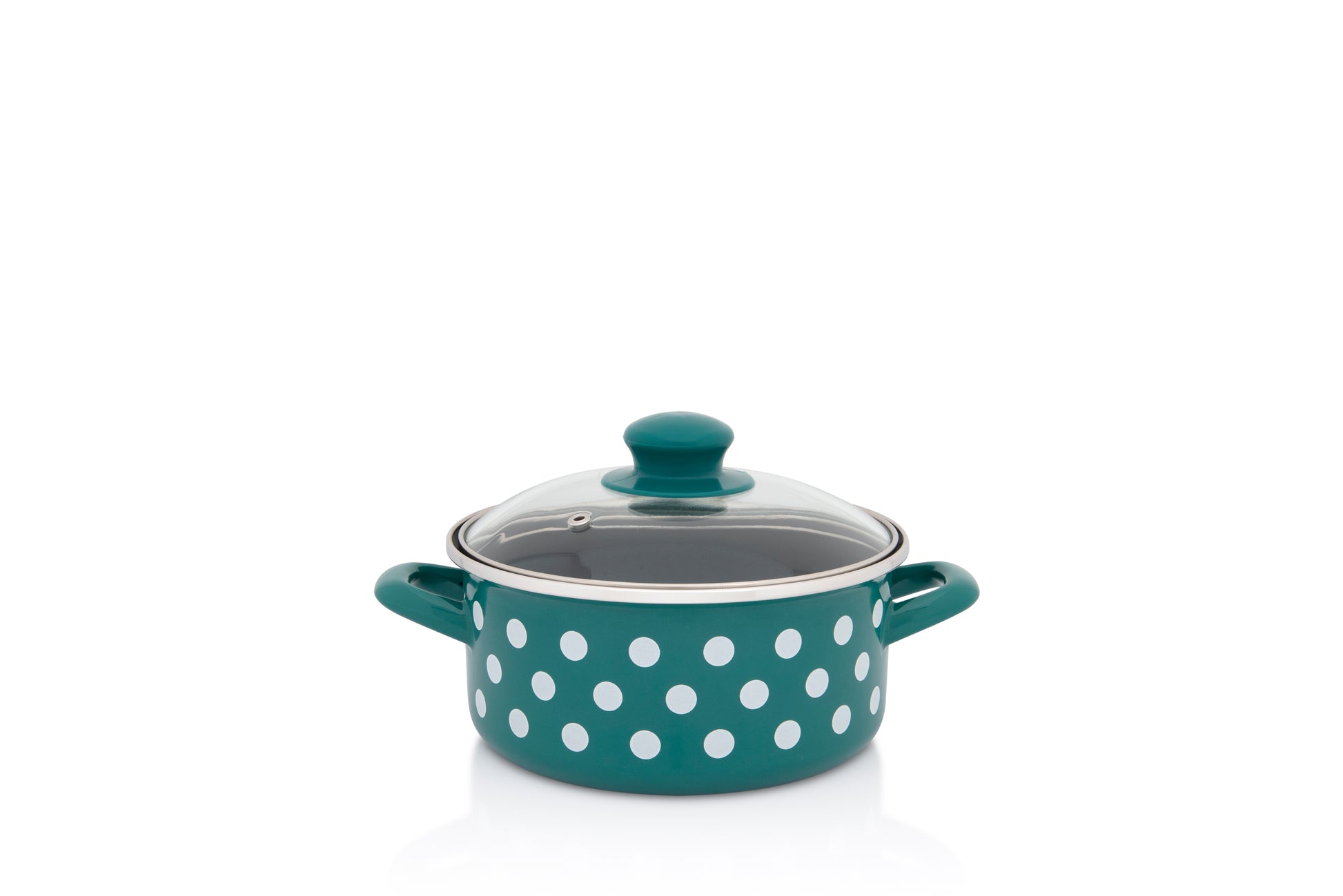 Metalac Schmortopf mit Glasdeckel 18cm|2,2l, GRÜNE PUNKTE, Emailliert, Vintage Design
