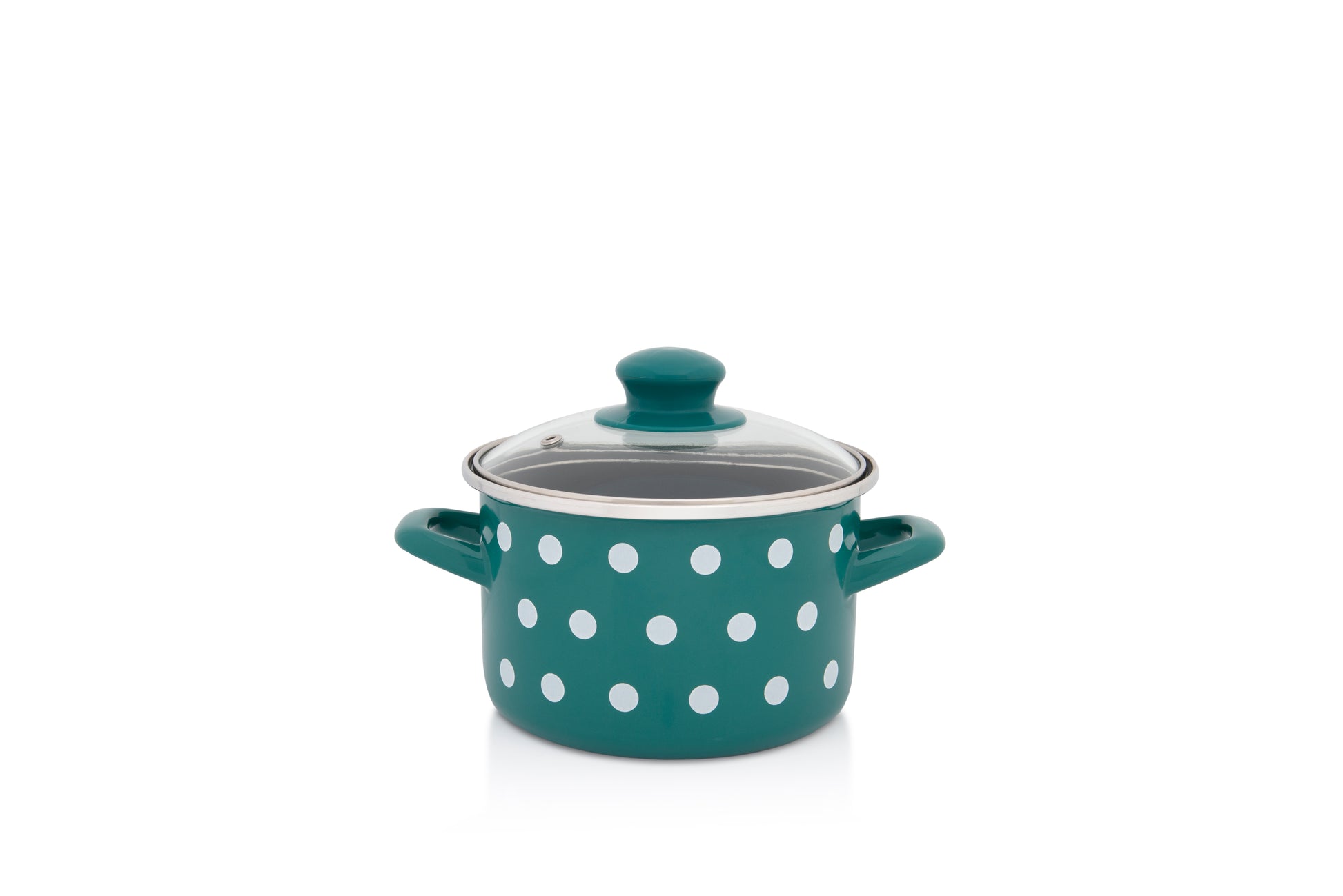 Metalac Kochtopf mit Glasdeckel 18cm|3l, GRÜNE PUNKTE, Emailliert, Vintage Design