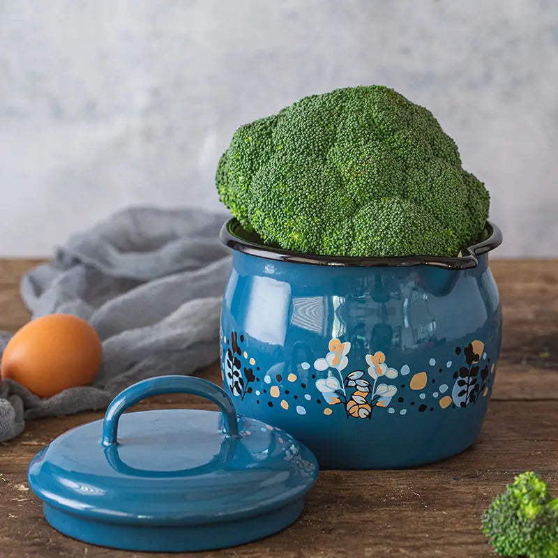 Die Cooking Delight Kollektion vereint charmantes Design und langlebige Funktionalität. Dieser Milchtopf in beruhigendem Blau, verziert mit einem zarten Blumenmuster, bringt Frische in jede Küche. Hergestellt aus hochwertigem Emaille, besticht er durch Robustheit und einfache Pflege – perfekt für Milch, Saucen oder Porridge.