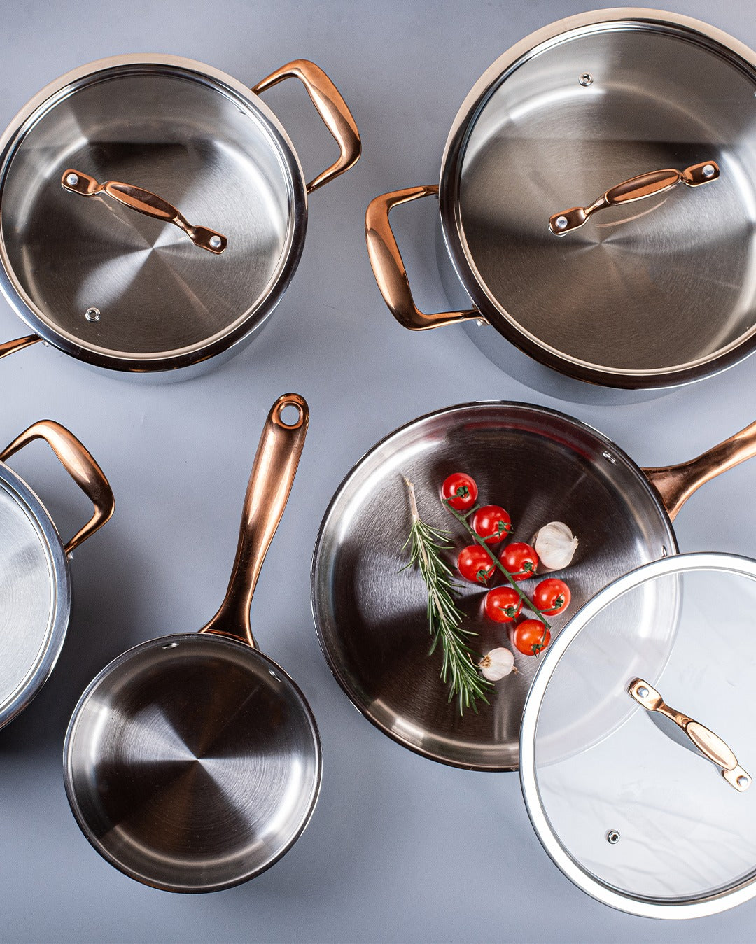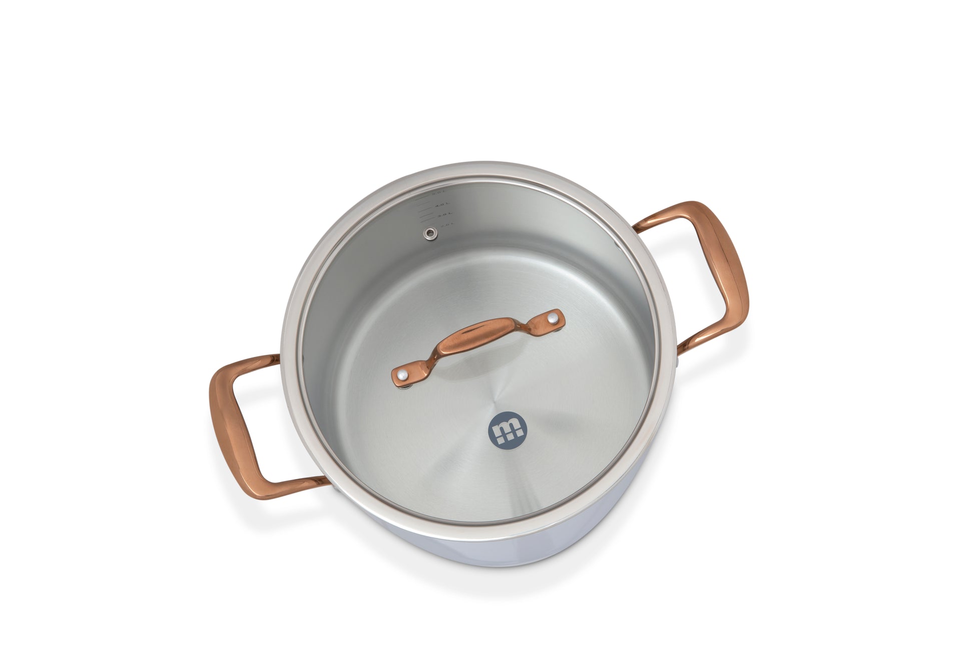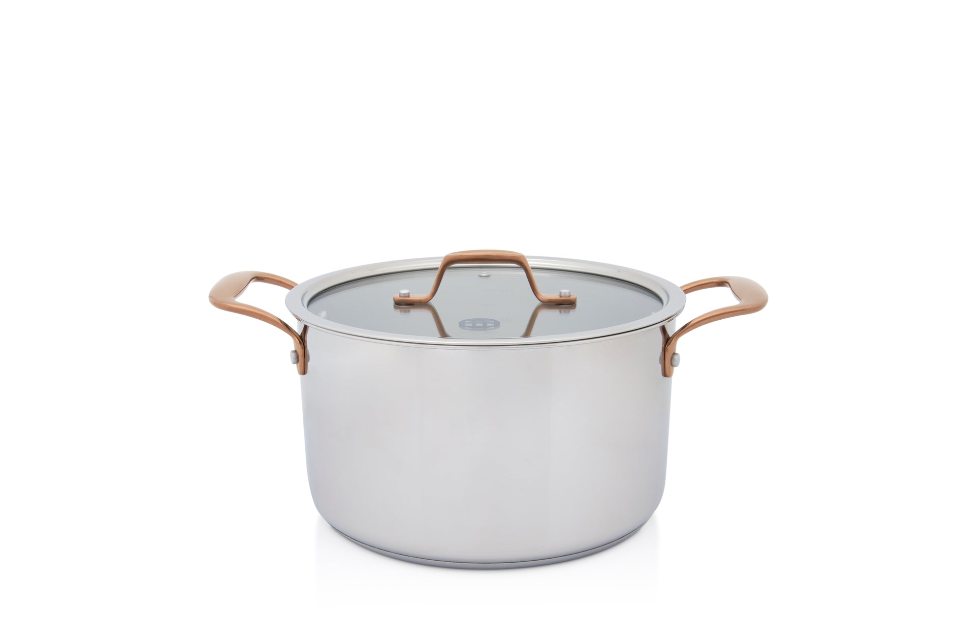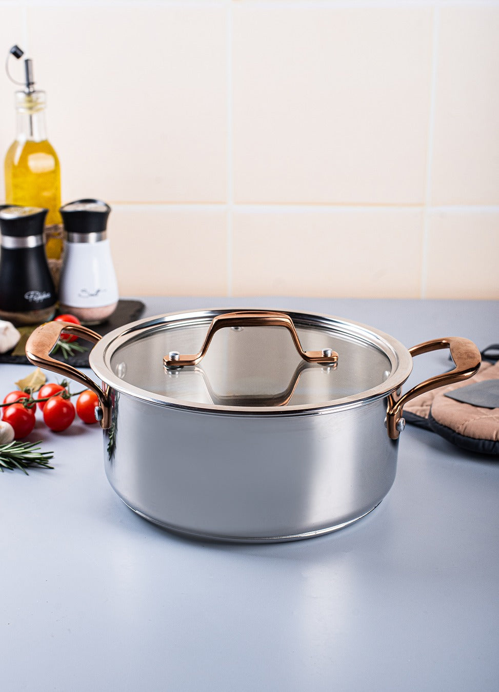 Die Venera Collection vereint zeitlose Eleganz mit robustem Profi–Standard. Hergestellt aus hochwertigem Edelstahl (CrNi 18/10) garantiert dieser Kochtopf eine optimale Wärmeleitung und langanhaltende Performance. Die edlen Kupfergriffe und der transparente Glasdeckel setzen stilvolle Akzente und machen „Venera“ zum Blickfang in jeder Küche.
