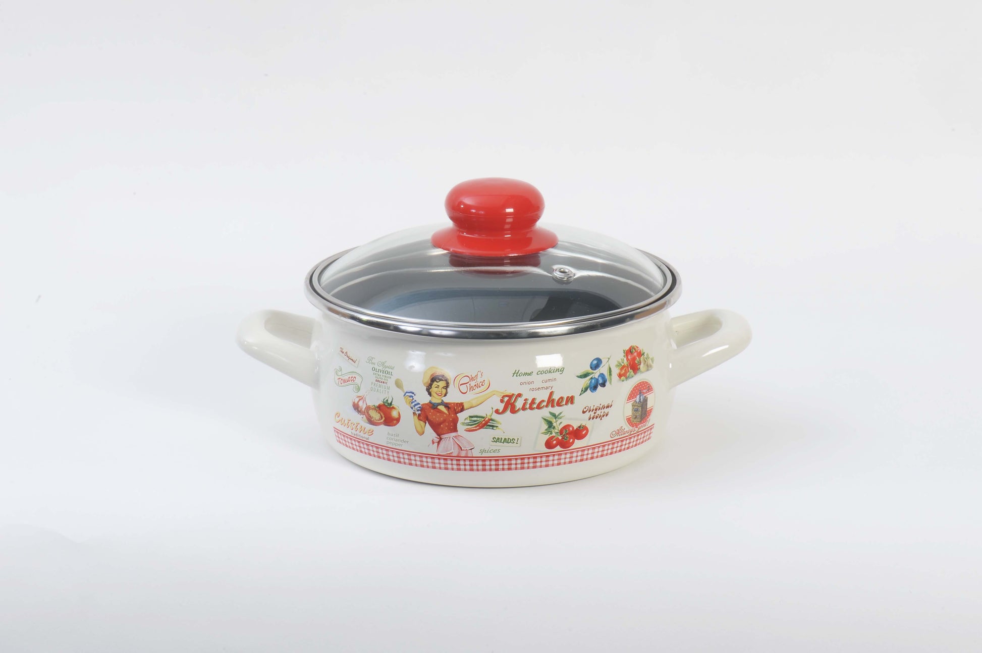 Metalac Schmortopf mit Glasdeckel 14cm|1,05l, FRÖHLICHE KÖCHIN, Emailliert, Vintage Design