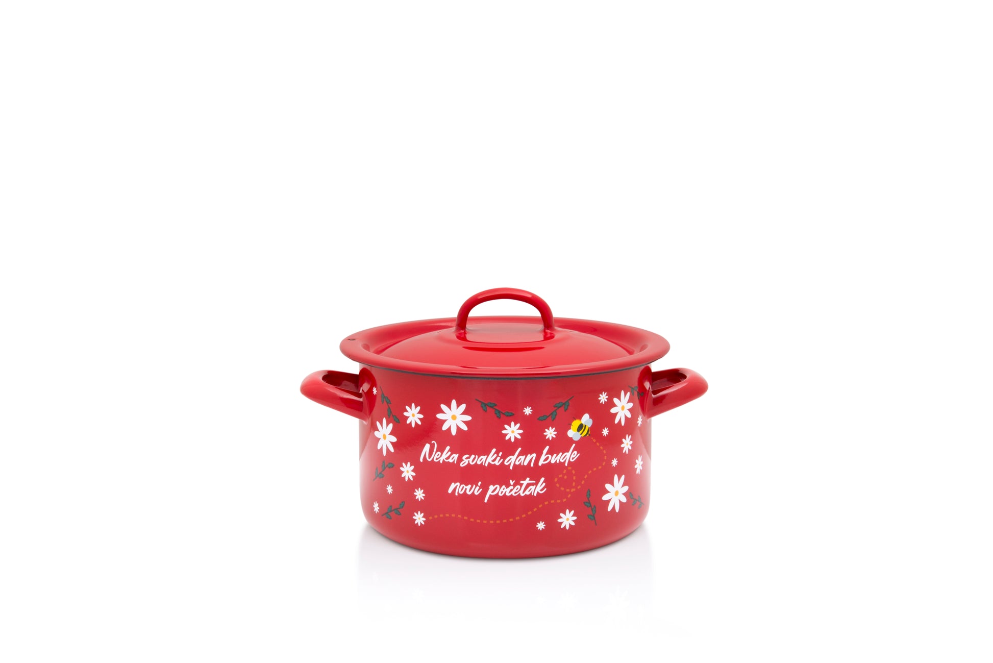 Tauchen Sie ein in die Welt der Errinerungen kuschliger Zeiten mit Oma und Geschmack ihrer köstlichen Gerichte mit Metalac Emaille-Kochgeschirr. Der leuchtend rote Topf mit verspielten Gänseblümchen, einer summenden Biene und dem Schriftzug "Neka svaki dan bude novi početak" (Möge jeder Tag ein neuer Anfang sein) verbreitet positive Energie. Robust, - kratzfest, -pflegeleicht, -geruchsneutral, - langlebig, - hygienisch, - umweltfreundlich