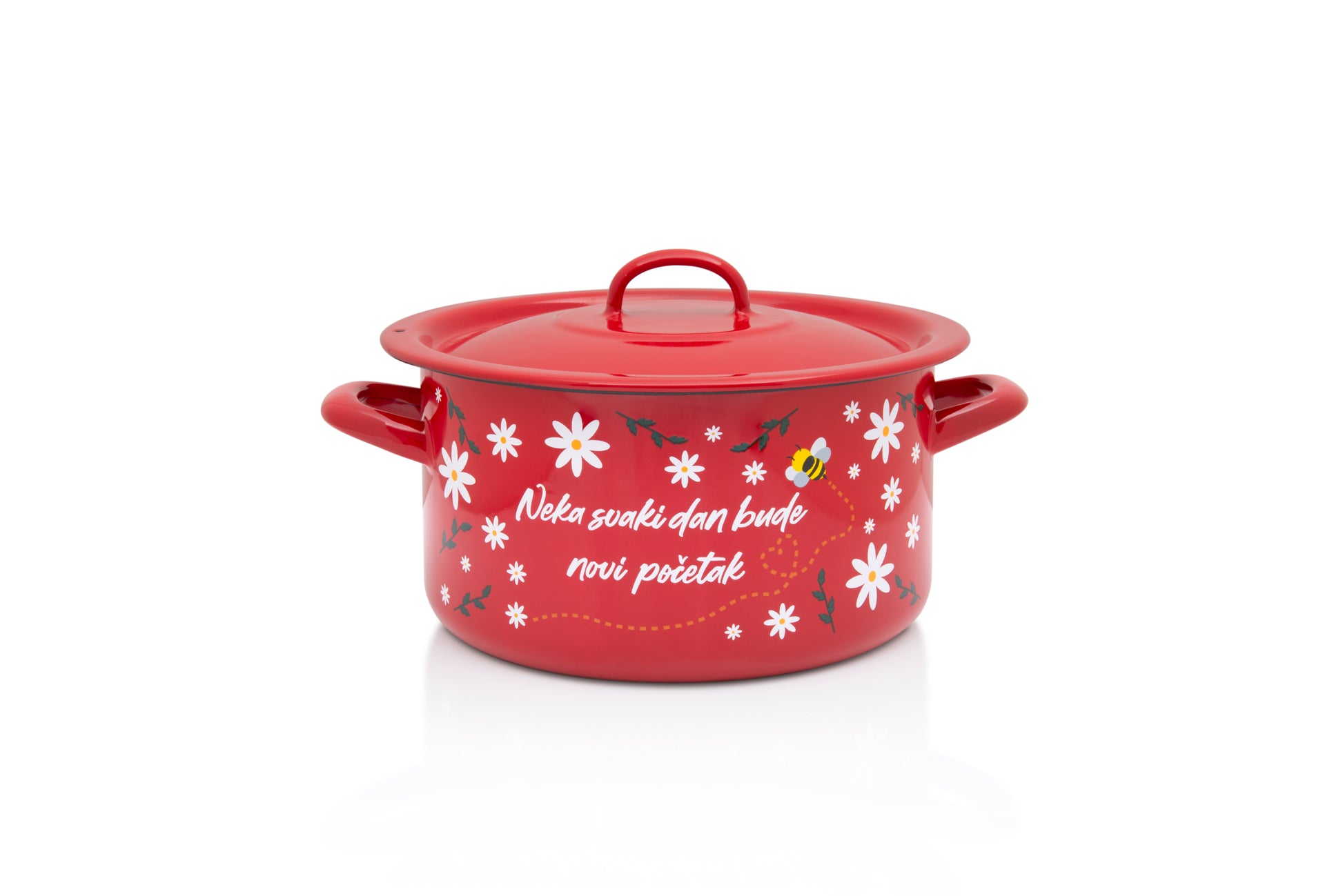 Tauchen Sie ein in die Welt der Errinerungen kuschliger Zeiten mit Oma und Geschmack ihrer köstlichen Gerichte mit Metalac Emaille-Kochgeschirr. Der leuchtend rote Topf mit verspielten Gänseblümchen, einer summenden Biene und dem Schriftzug "Neka svaki dan bude novi početak" (Möge jeder Tag ein neuer Anfang sein) verbreitet positive Energie. Robust, - kratzfest, -pflegeleicht, -geruchsneutral, - langlebig, - hygienisch, - umweltfreundlich