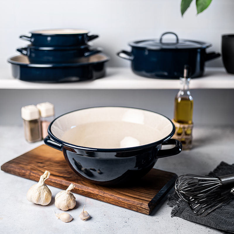 Emailliertes Geschirr ist langlebig, widerstandsfähig gegen chemische Einflüsse und Abnutzung und äußerst einfach in der Pflege. Es eignet sich für alle Herdarten, einschließlich Induktion.